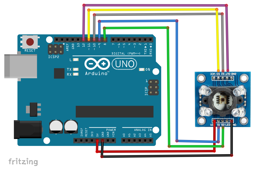 - Anslut GND-pinnen på TCS3200 till GND på Arduino.